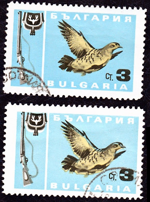 Nelle foto un francobollo della Bulgaria del 1967, ritraente un pernice, da 3 ct (numero 1566, A672) di una serie di 6 valori dentellati 11 per 10 e mezzo. L'esemplare in basso presenta un fuori registro del colore nero che è spostato verso l'alto rispetto agli altri colori così da fare in modo che la cifra Ct.3 sia in alto rispetto a quello sopra.
